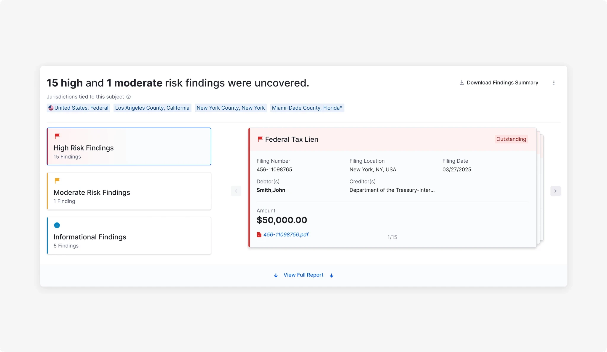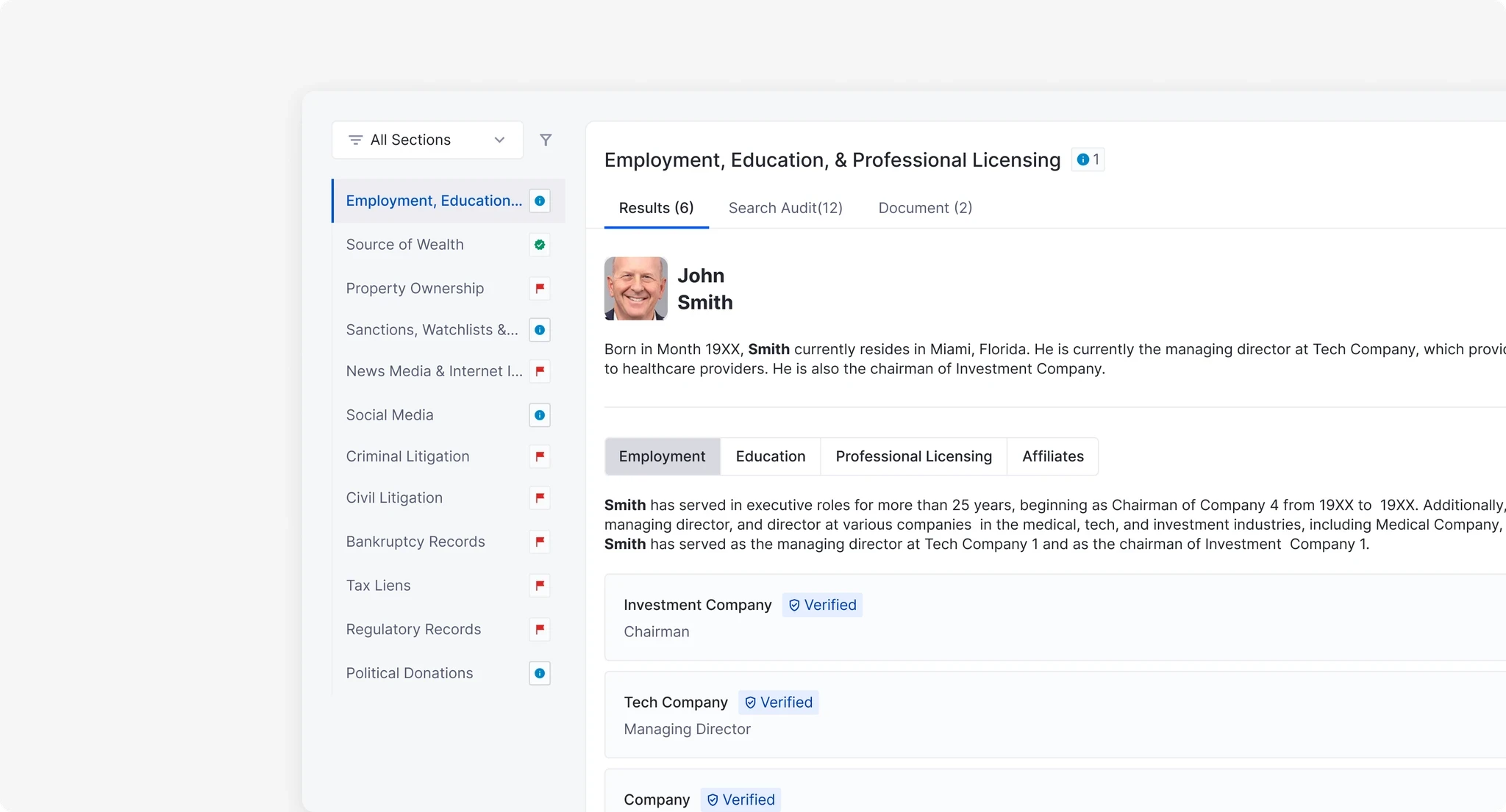 The Search Audit tab lives inside each section, documenting every jurisdiction searched and every source accessed, right next to the finding it supports. No appendix. No cross-referencing.