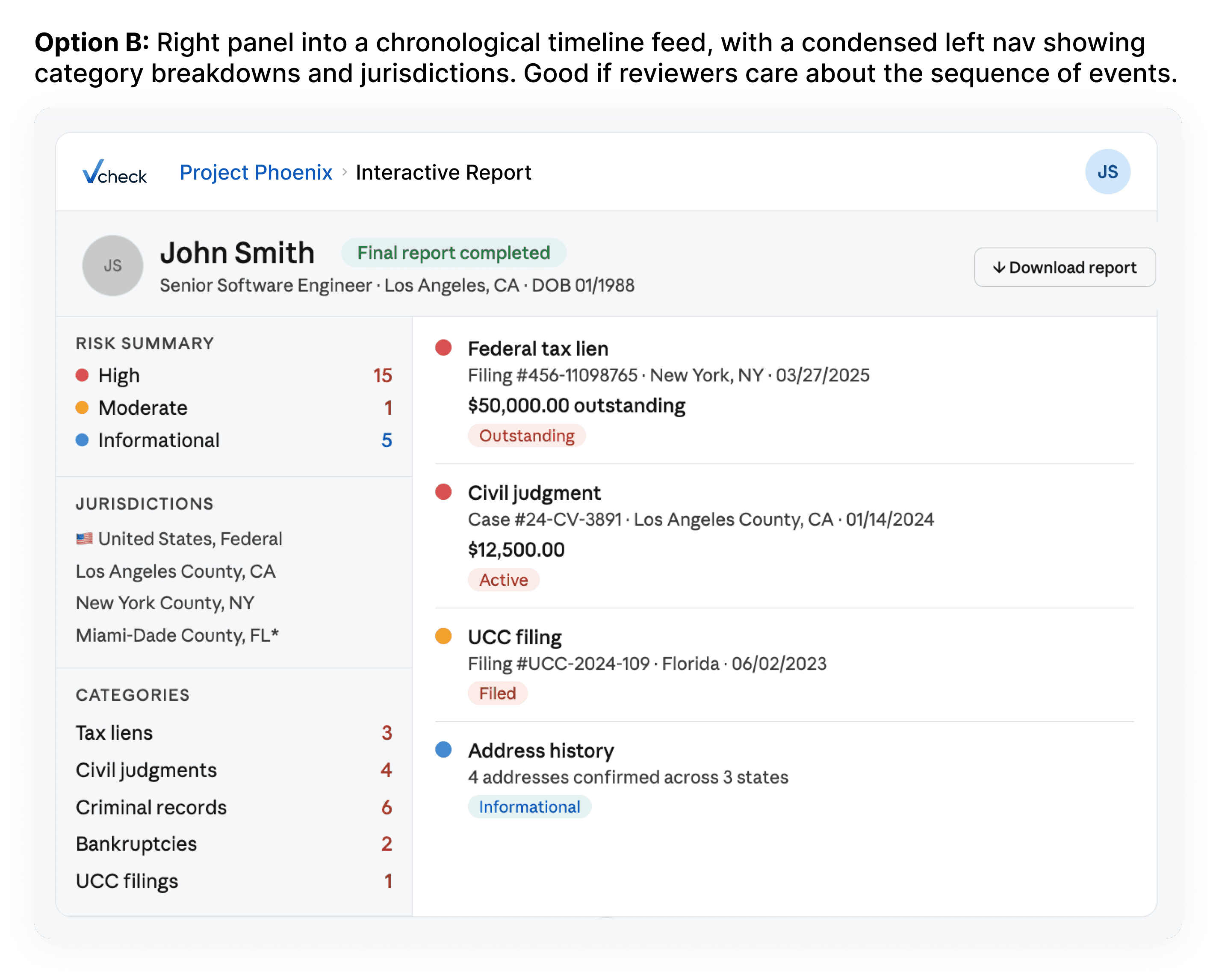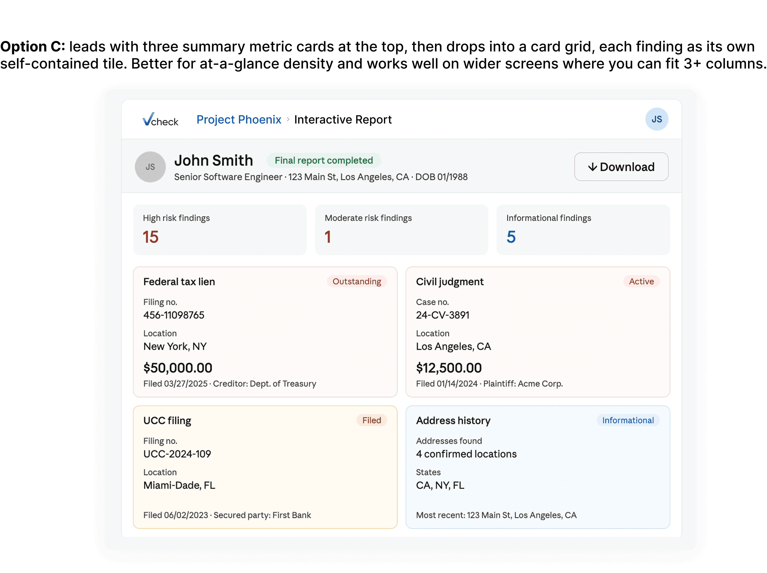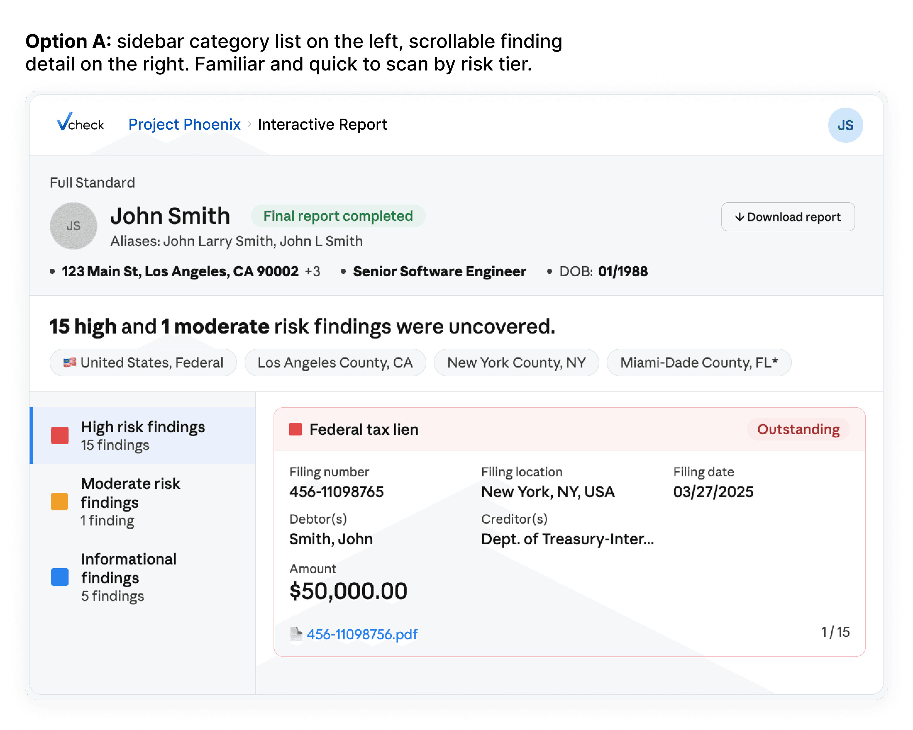My main contribution early on was wireframing and laying out the order of the risk summary, section nav, and finding details. We went with option A as the cleanest layout that displayed the risk summary.