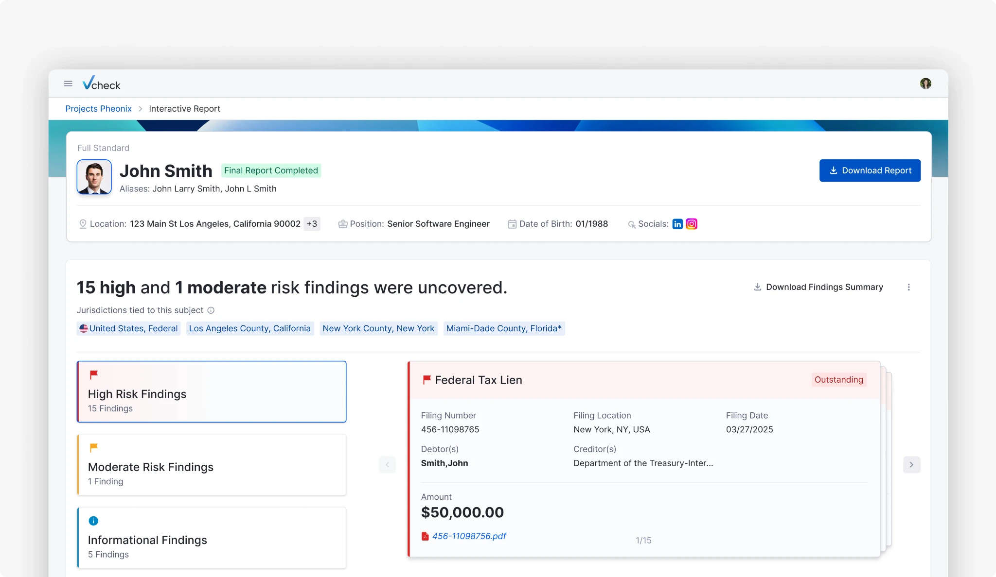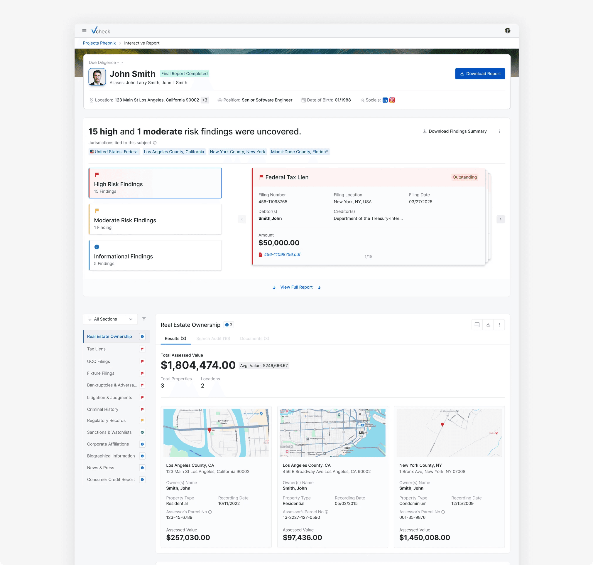 PE firms, law firms, and financial institutions hire Vcheck to run background investigations before signing. 150+ investigators. 25,000+ reports a year. Every one delivered as a PDF.
