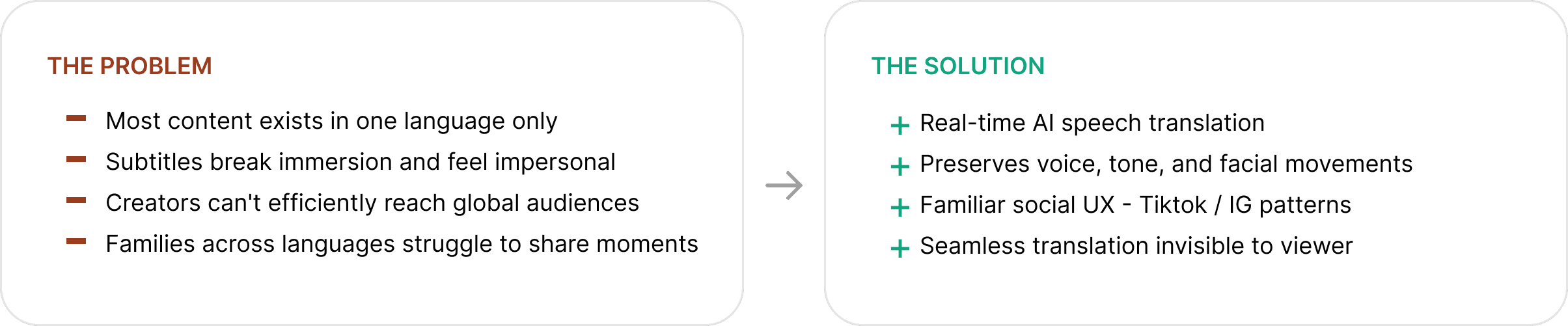 Most content exists in one language only. Subtitles break immersion and feel impersonal. Creators can't efficiently reach global audiences. Families across languages struggle to share moments