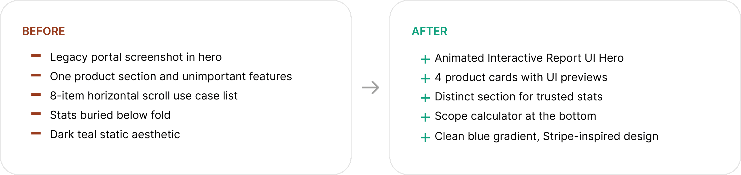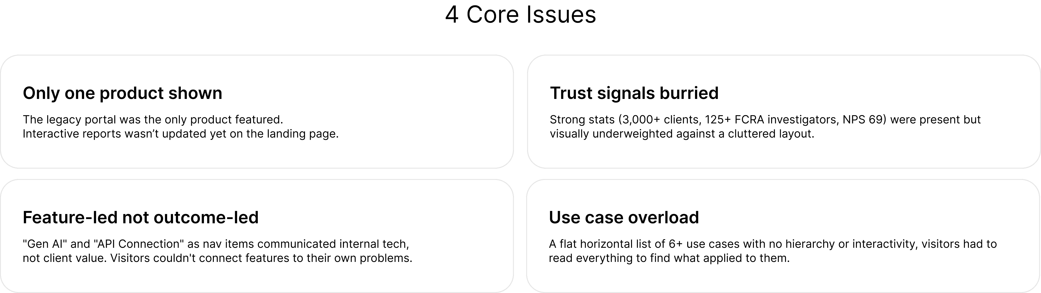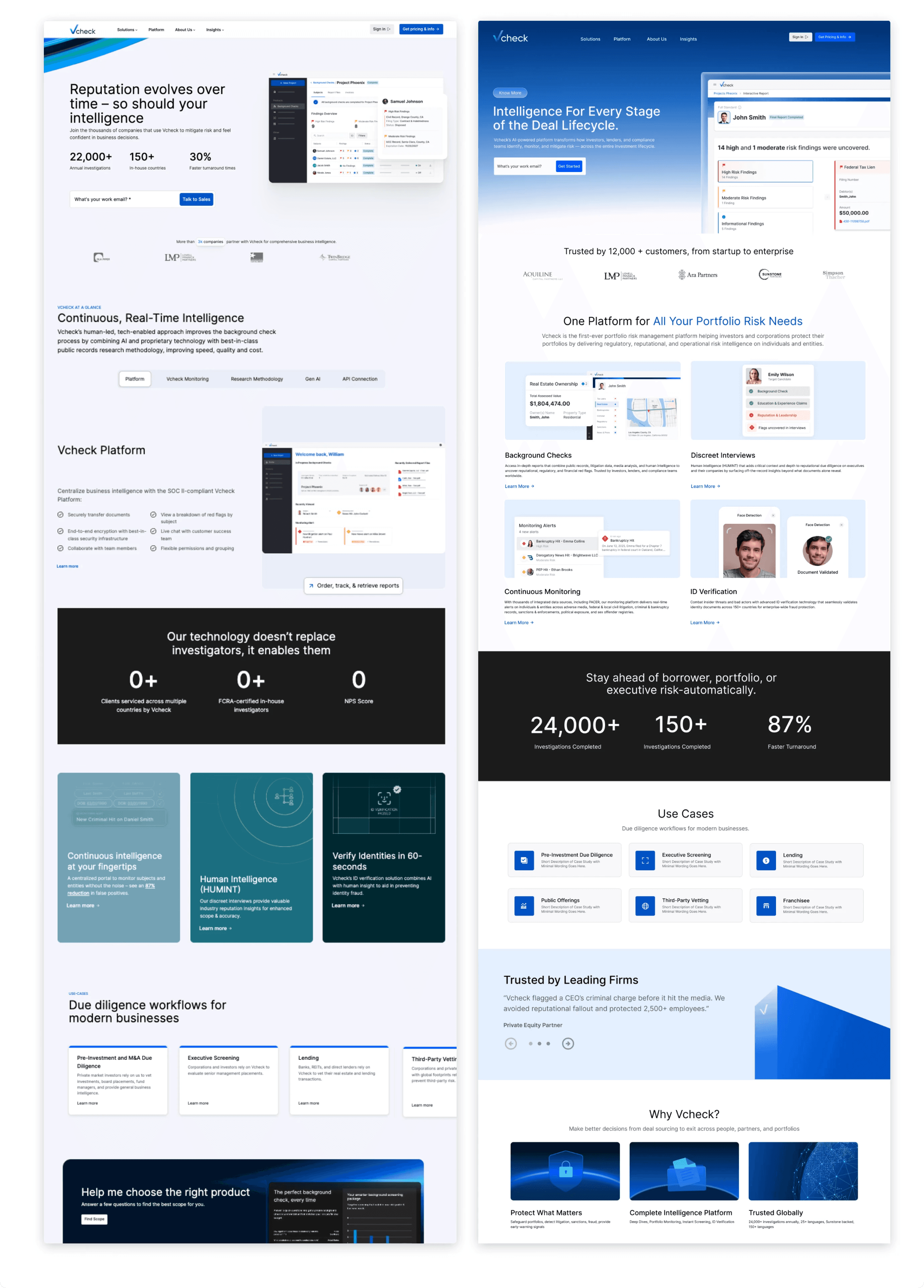 Vcheck was transitioning from a services company to a SaaS platform and launching interactive reports, a new flagship product. But the marketing site still featured the legacy portal, buried stats, and feature-named navigation that meant nothing to clients.