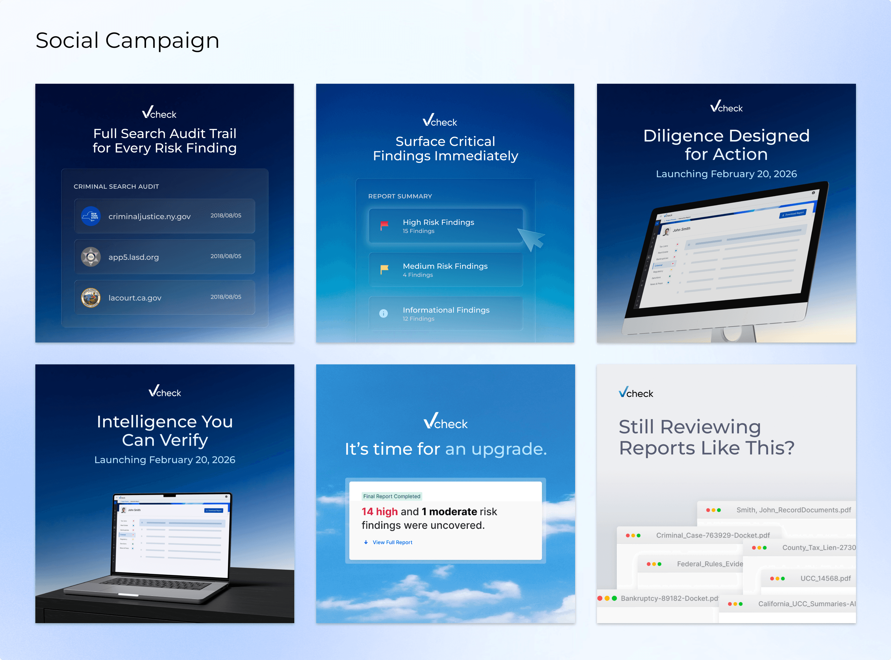 For the launch, I redesigned Vcheck’s homepage and created product visuals across web and marketing, working closely supporting product and web development.